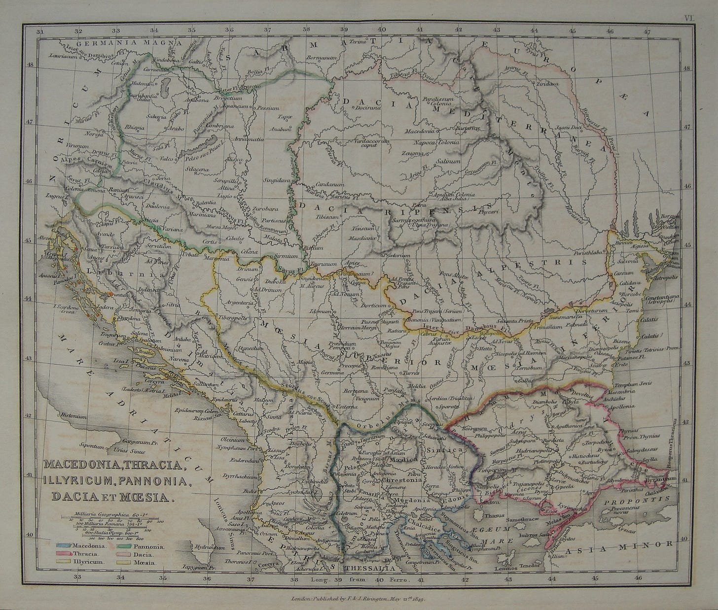 – Macedonia, Tracia, Iliria, Panonia, Dacia si Moesia – 1849, Londra, publicata de Francis & John Rivington – aceeași mențiune ca mai sus;