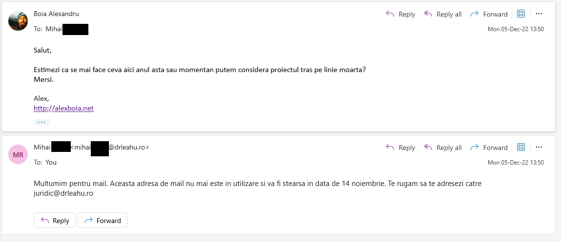 Asemeni unui cadvru în descompunere, povestea a mai tras câteva pârțuri puturoase la finalul lunii decembrie a aceluiași an, când o oarecare doamnă sau domnișoară Alandală îmi scrie nici mai mult, nici mai puțin s-o ajut c-o copie a mesajelor de lucru cu fostul managerul de proiect. Îl maziliseră, îi șterseseră căsuța de poștă electronică și nu mai știau nimic de proiect.