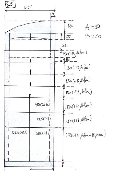 N-am vrut să las netocmite polițele din jumătatea superioară, cele de lungime completă, așa că le-am tras pe mijloc câte un separator de 50 mm înălțime, montat în canale de 5 mm adâncime. Sub șăpcălie am gândit o mască din cireș (două coloane laterale și o arcadă) și-n partea de jos am făcut găurile pinilor de susținere pentru polițele reglabile.
