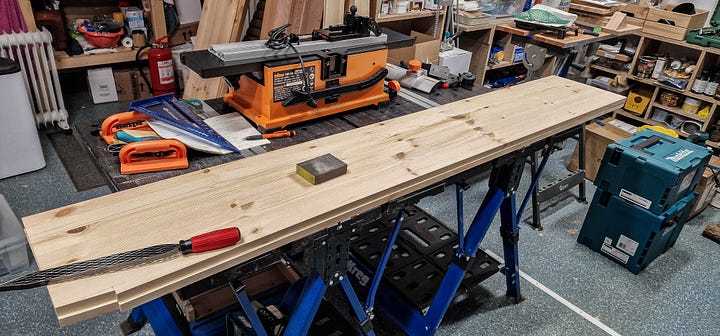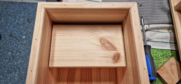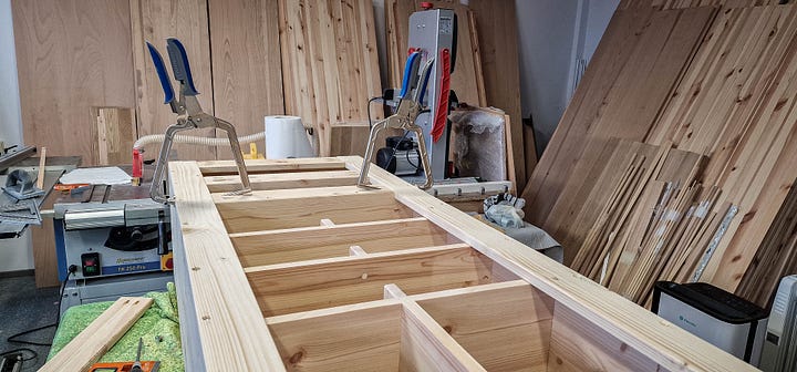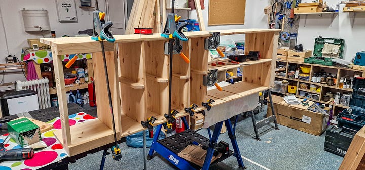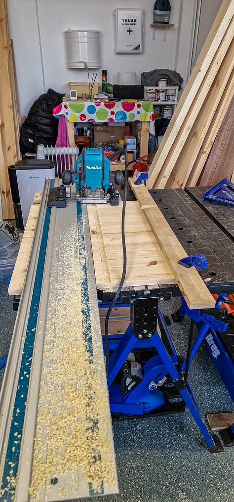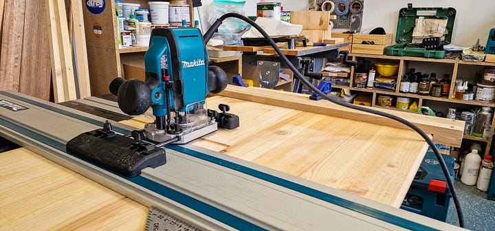 Cu panourile de pin pregătite și dimensiunile bătute-n cuie, am trecut la împărțirea volumelor și la îmbinările propriu-zise. M-am încumetat să încerc ceva nou — canale transversale (dados) executate cu mașina de frezat — convingându-mă rapid că toleranțele materialului și lipsa mea de antrenament mi-au complicat serios viața. Suficient cât să-mi ajustez abordarea pe viitor.
