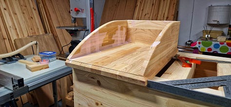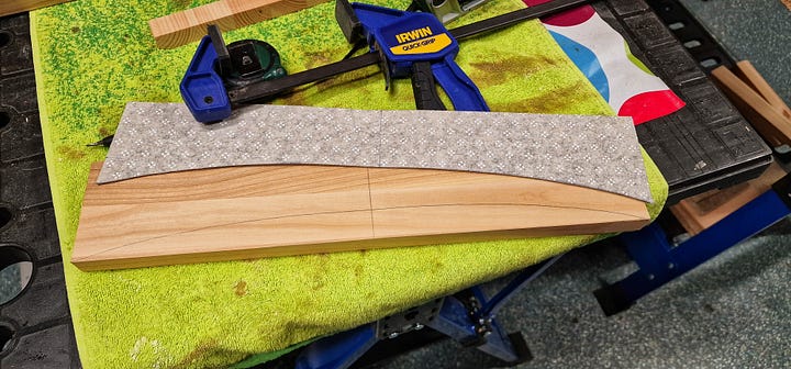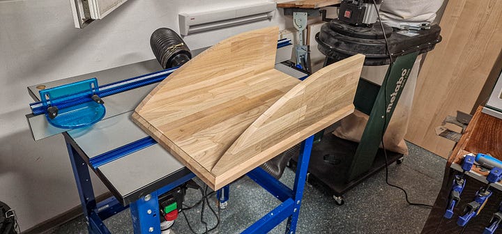 Între timp am teșit muchiile corpului, am montat segmentul de cireș de sub pălărie și…m-am abătut puțin de la proiect pentru a face un suport de încălțăminte tip „catamaran”, din resturi de lemn, pe care l-am folosit ca piesă de test pentru lacul ales.