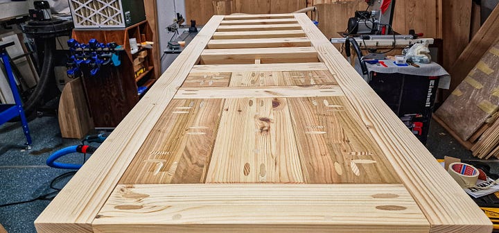 Ușile le-am planificat în stil cadru din cireș cu panou central din pin, iar piesele de umplutură pentru spatele aferent zonelor deschise le-am făcut tot din cireș, ieșind un contrast plăcut.