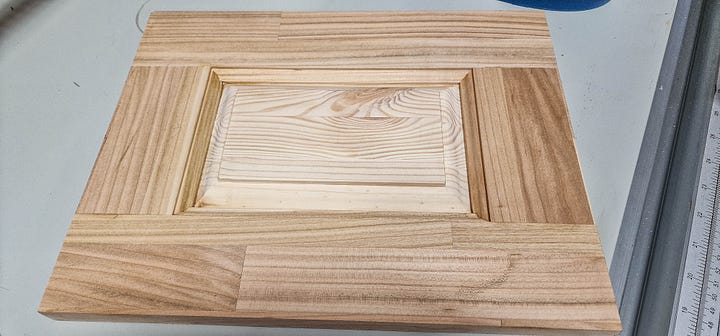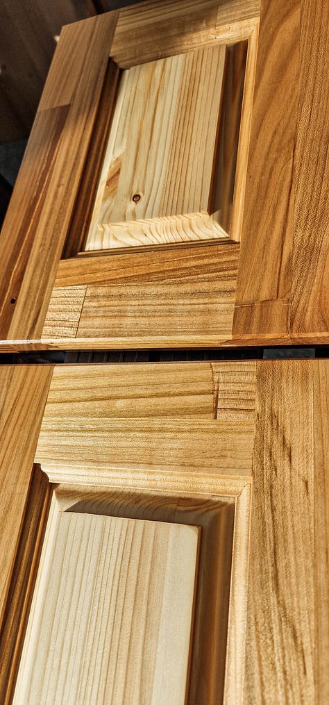 Pentru uși, așadar, am mers pe ideea clasică de cadru cu panou flotant, nu doar pentru stabilitate la variații de umiditate, ci și pentru efectul vizual. Am avut noroc să găsesc lemn de cireș cu spalting, așa că am tăiat piesele pentru-a valorifica inserțiile mai spectaculoase. Reglajul capetelor de frezare a fost o muncă în sine, cu teste repetate și ajustări fine, păstrând piese-martor pentru referință ulterioară.