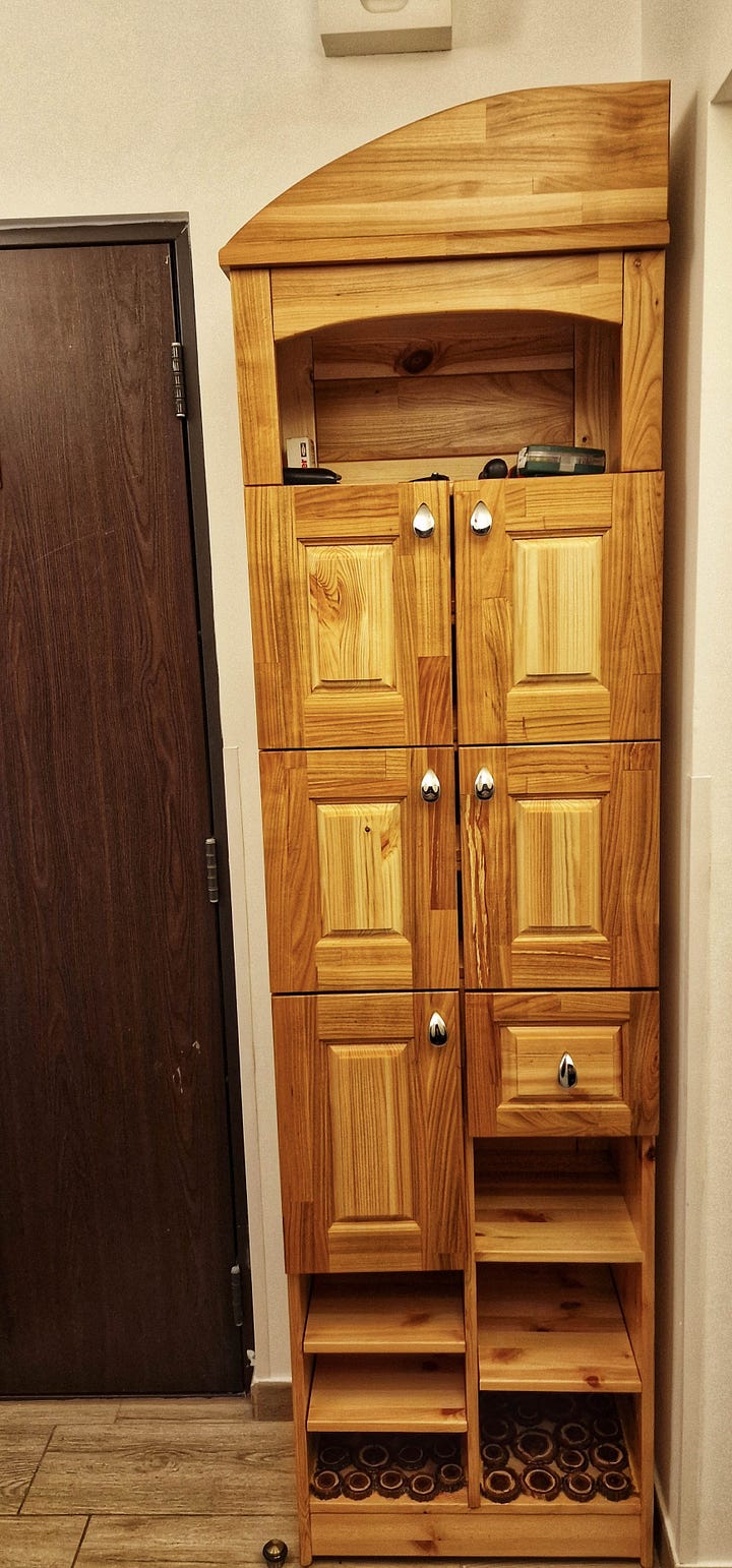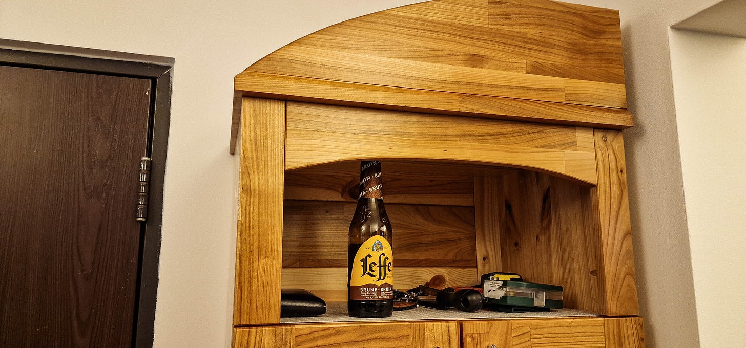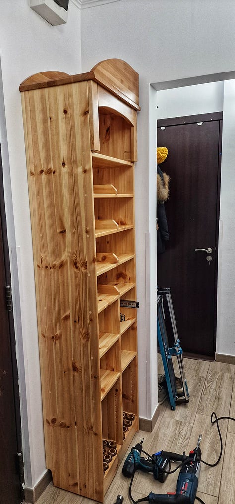 Am încheiat proiectul cu o combinație de ușurare și satisfacție. Cu două sticle de Leffe Brun alături, am pus încălțămintea pe noile rafturi și am privit pantofarul nu doar ca pe o piesă de mobilier, ci ca pe o poveste întreagă, scrisă în lemn, chit și lac.