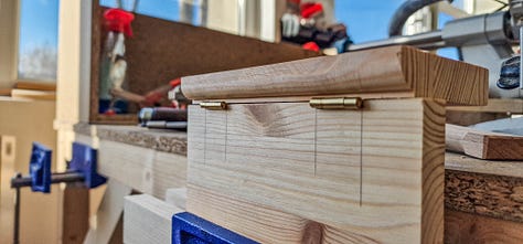 Montajul balamalelor a fost o mică bucurie: prima dată când am lucrat cu dalta la ceva atât de fin. Am decupat lăcașurile cu grijă, repetând lucrarea de mai multe ori până am obținut o precizie rezonabilă.
