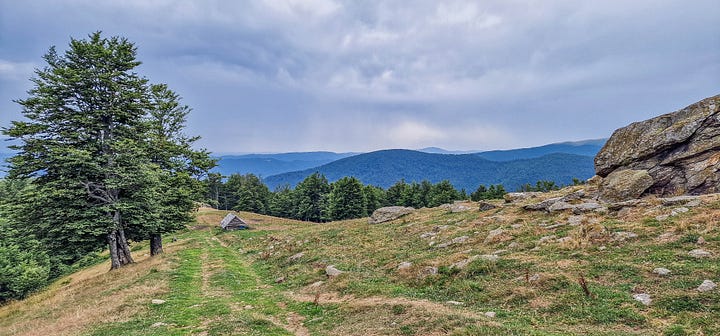 Ne-am oprit și noi acolo pentru a ne scoate pelerinele, întrucât ne-ajunseseră primii stropi de ploaie. Am sfârșit prin a face o pauză mai extinsă, ne-am reaprovizionat și cu apă căci până de vale nu se mai găsește și, în tot acest mișmaș am uitat pelerina acolo, neremarcând din prima, întrucât ploaia se oprise.