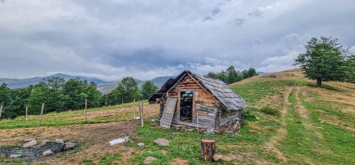 La limita pădurii există un sălaș, cel mai probabil o fostă stână. Deși părăsită, nu-mi pare un loc dedicat ascezei: scrijeliturile din exterior și din interior zugrăvesc cumva o istorie a chiolhanurilor pastorale și arată că până și bețivii au momente de grație, reușind să se iscălească, cu nume și dată, în locurile cele mai neprielnice. Amintesc cu reverență, pe această cale pe: Emy, Puiu, Lomen (?), Willy G, Pantera (?), Daniel și, desigur Pula.
